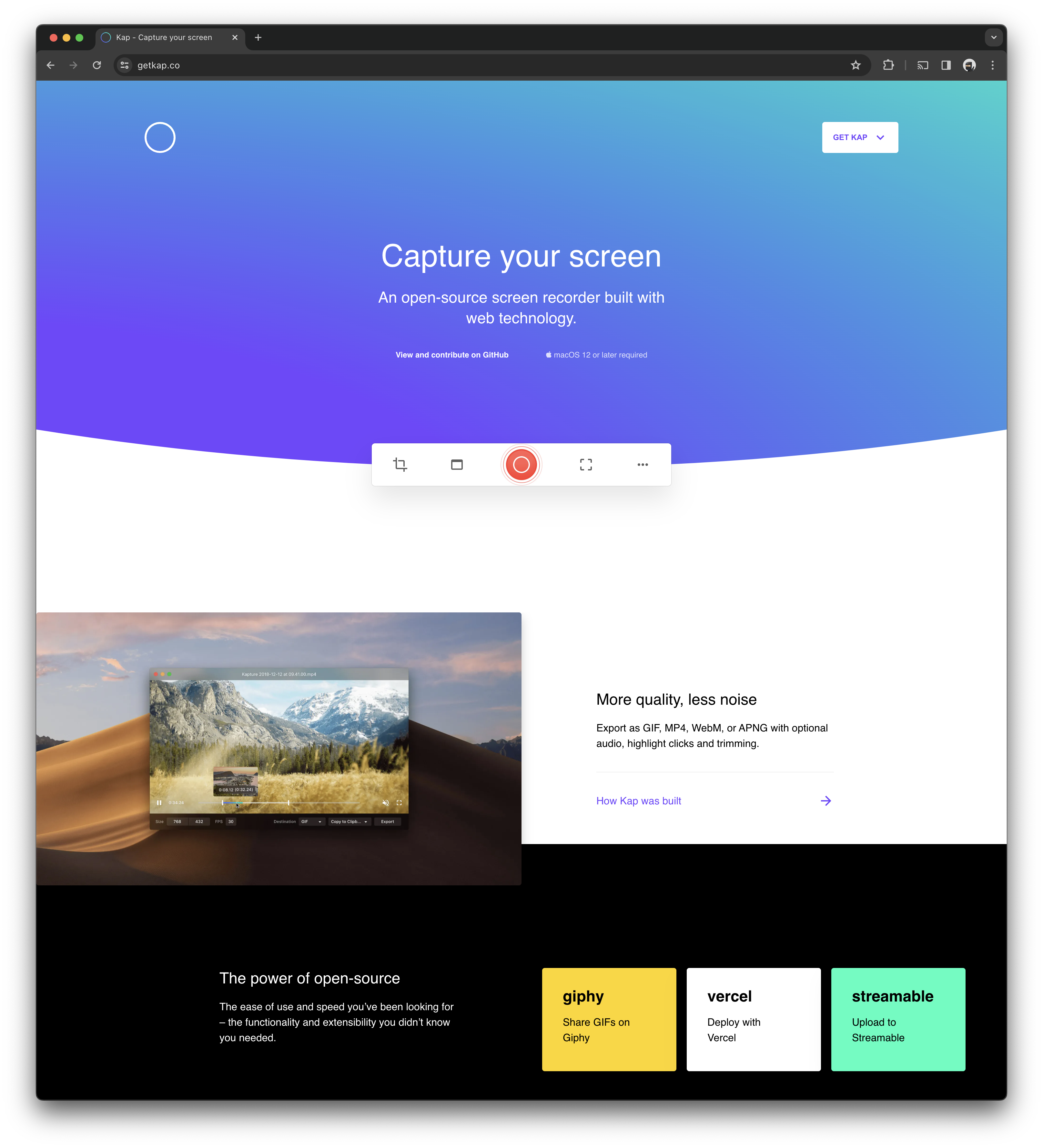 Kap, is an open-source screen recorder for macOS that makes it easy to capture your screen and turning them into different formats.
