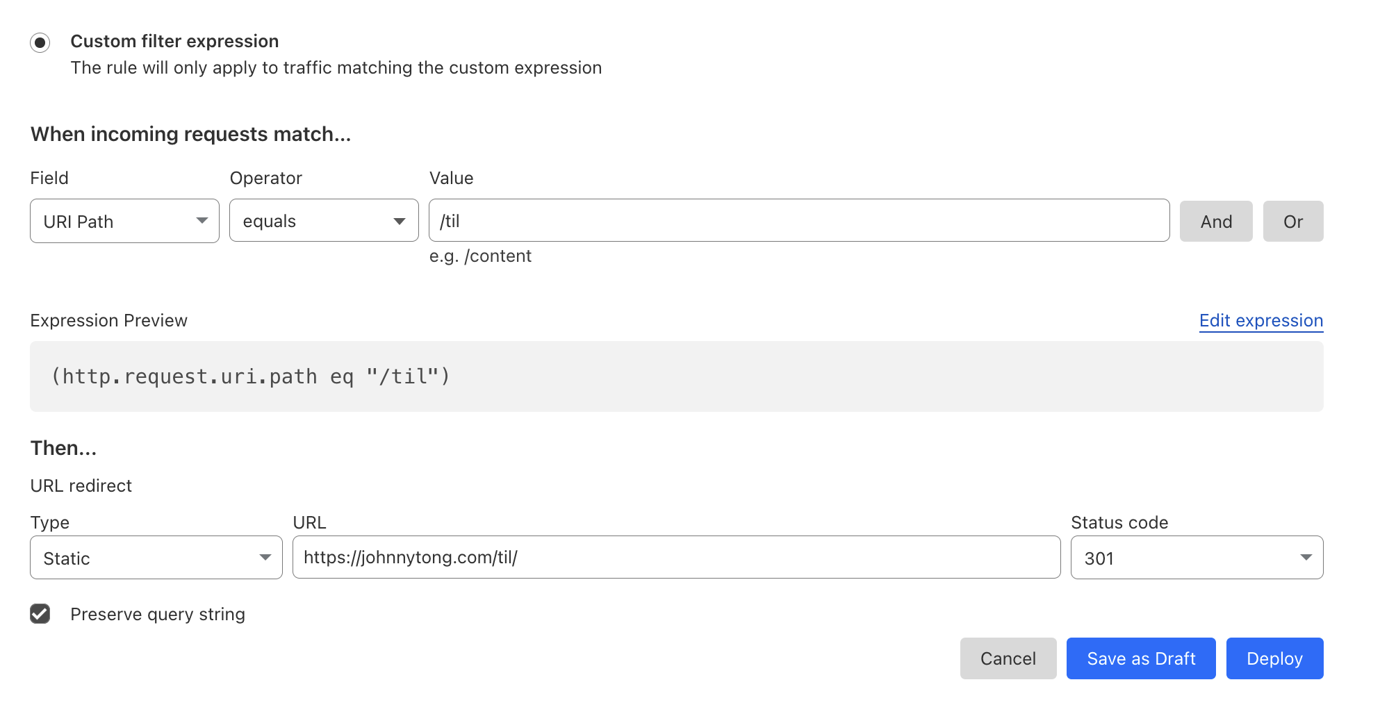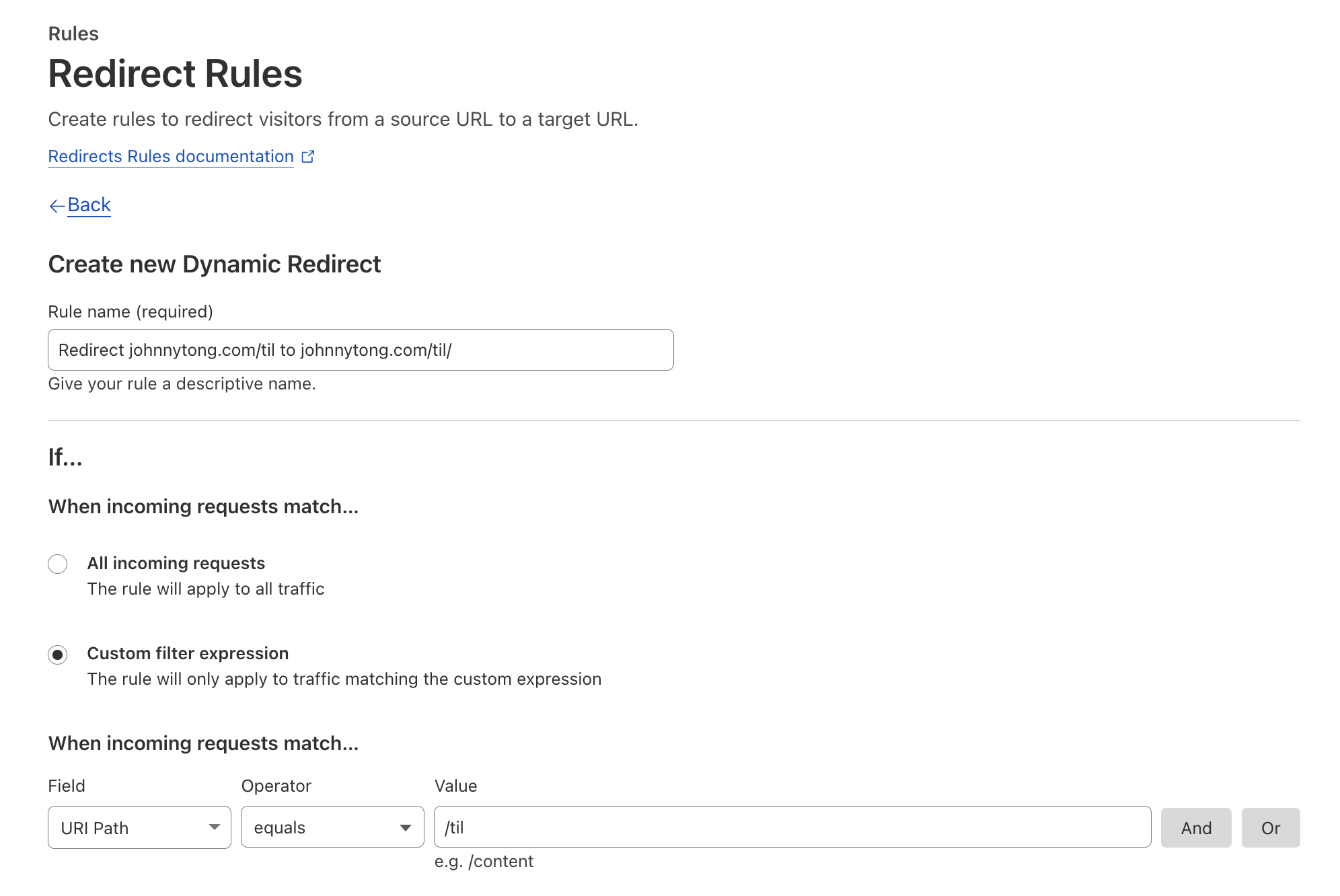 Since we want users typing in johnnytong.com/til to go to johnnytong.com/til/. We can use Cloudflare to perform a redirect.